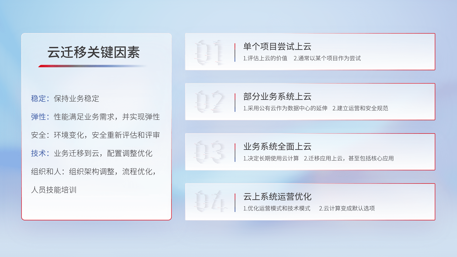 结合实际业务,,,,从规划设计、、、云平台选型、、云原生改造、、、数据迁移、、、、集成交付,,迁移全过程为客户识别最佳上云路径,,,做好风险识别管理,,设计网络架构、、身份权限、、、安全审计合规、、、、操作审计、、、日志审计、、监控告警策略、、、多站点容灾设计等,,,,对云上基础设施进行整体规划,,,提升IT治理水平,,,,以满足弹性、、、、高可用、、、、高性能的需求。。